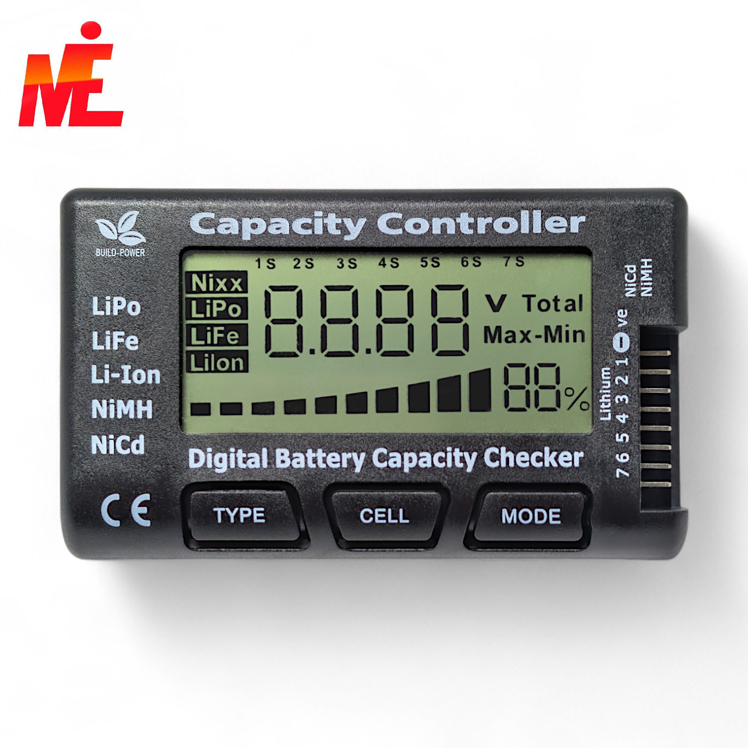 Cellmeter-7 – аккумуляторный тестер, который должен иметь каждый RC моделист. Он способен измерить напряжение каждой ячейке и всего аккумулятора в целом, а также показать оставшуюся его емкость. Кнопка выбора режима измерений позволит вам замерить самое высокое и самое низкое напряжение ячеек и покажет разницу напряжений на ячейках при подключение через балансировочный разъем аккумулятора. Также имеется дополнительный 3-pin порт для подключения NiМH / NiCd аккумуляторов приемника.