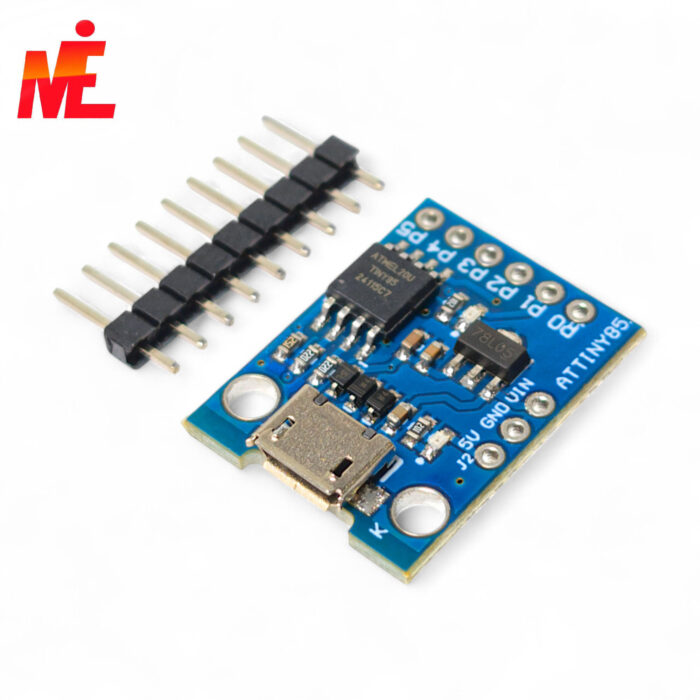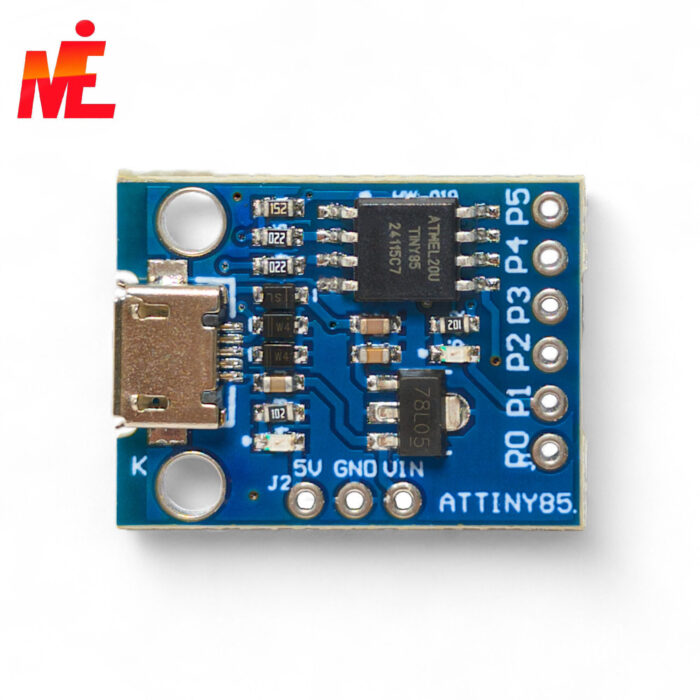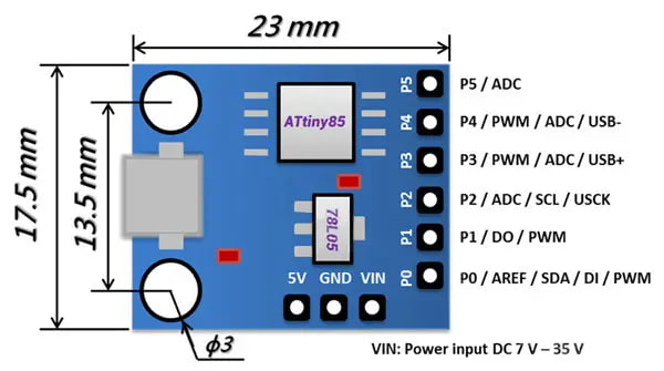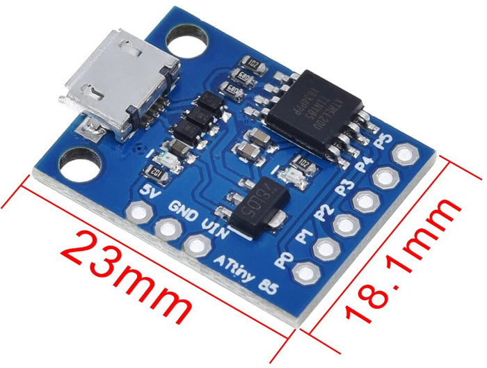 Плата разработчика ATTINY85 предназначена для разработки устройств с минимальными требованиями к периферии и возможностью непосредственного подключения к USB интерфейсу компьютера для программирования и отладки. Для подключения к компьютеру требуется кабель microUSB. У контроллера выведено 6 выходов и все они доступны для использования. Два зарезервировано для работы с USB интерфейсом, к одному подключен светодиод. Для разработки можно использовать среду разработки Arduino IDE (OSX/Win/Linux).