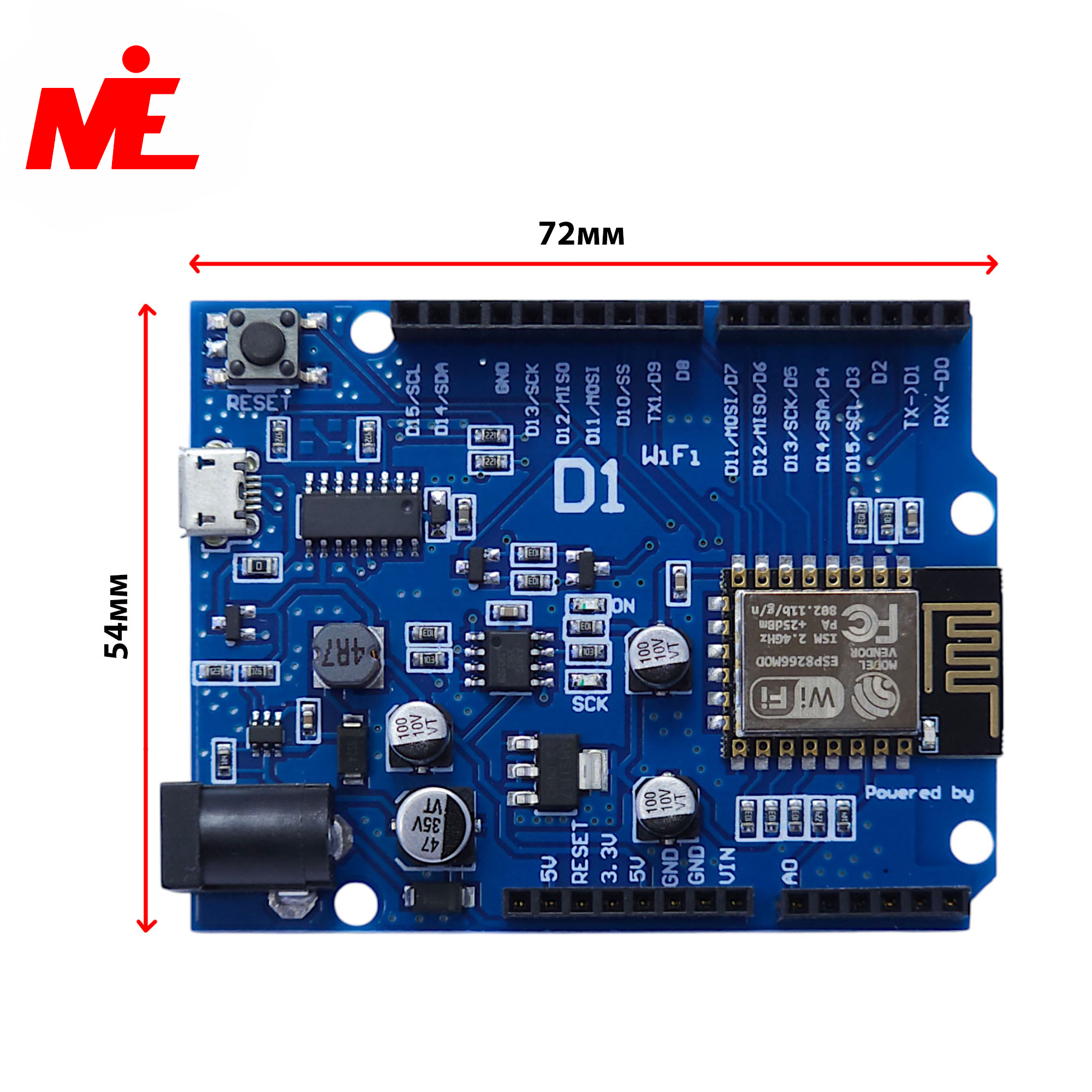 WeMos D1 — это мощная платформа для создания устройств «Интернета вещей» (IoT), объединяющая производительность популярного Wi-Fi модуля ESP8266 и удобный форм-фактор классической Arduino UNO. «Сердцем» платы служит чип ESP-12E с тактовой частотой 80 МГц (до 160 МГц) и 4 МБ флеш-памяти, что значительно превосходит возможности стандартных AVR-контроллеров. Благодаря совместимой распиновке и размерам, вы можете использовать многие существующие корпуса и платы расширения (шилды) от UNO, что существенно упрощает сборку проектов.
