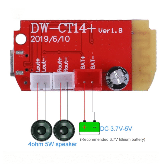 Bluetooth аудио модуль DW-CT14+ предназначен для передачи аудио сигнала на расстоянии и идеально подходит для создания беспроводных наушников и колонок. Также DW-CT14+ можно встроить в автомобильную аудиосистему и с помощью смартфона воспроизводить любимые треки. На плате имеется две микросхемы аудио усилителя класса D, мощностью по 3 Вт. каждая.