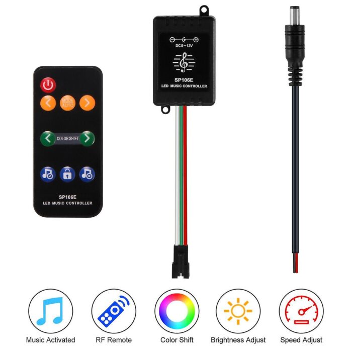 Обратите внимание на контроллер светодиодных лент с индивидуальной адресацией SP106E, который отличается малым весом и небольшими размерами. Пульт дистанционного управления с девятью клавишами входит в комплект и может работать с большинством интеллектуальных ИС, таких как WS2811, WS2812B, 16703, 1903 и т. д. Адресный светодиодный контроллер поставляется с 3-контактным разъемом JST SM «мама», который упрощает подключение к светодиодным лентам Pixel, а максимальное количество загружаемых пикселей составляет 600 шт . Индивидуально адресуемый светодиодный контроллер имеет 25 встроенных режимов освещения, в том числе пять музыкальных шаблонов и 20 обычных шаблонов. В музыкальных режимах освещение будет автоматически меняться в соответствии с ритмом музыки. В обычных режимах яркость цвета регулируется.